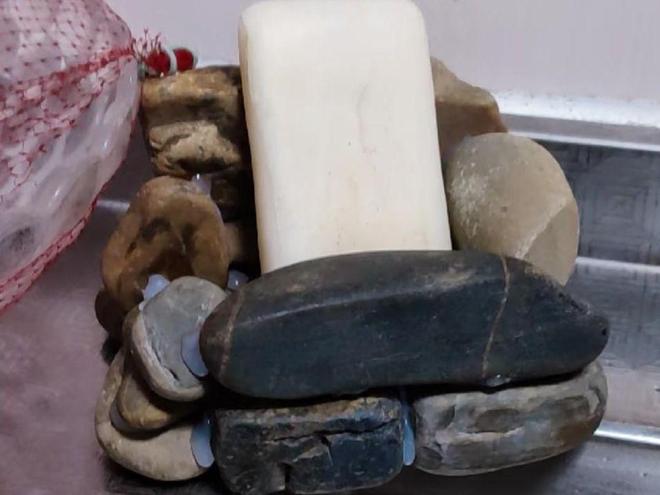 处理以后,将2~3块鹅卵石堆叠或者并排放在一起,一个肥皂垫子就出现了,将肥皂放在上面就行了。
