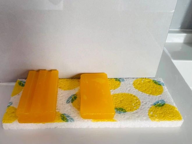 只要你家里有闲置的硅胶垫,例如硅胶地垫、硅胶烤垫都可以,剪下一个小方块,例如8×8厘米,一个肥皂垫就出现了,将肥皂放在上面就行了。