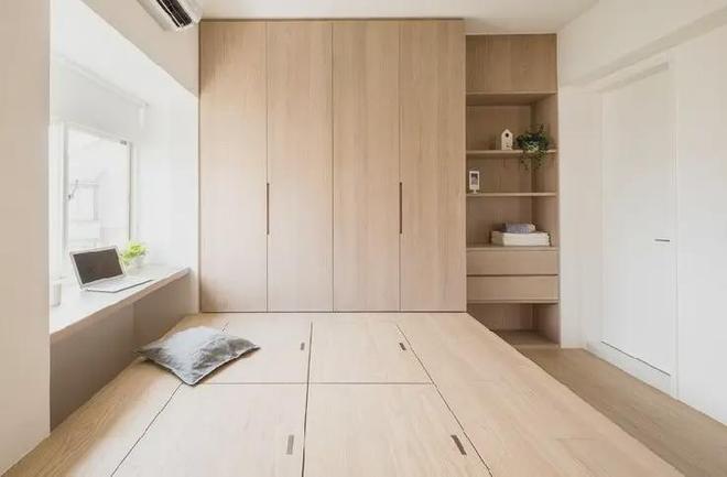 对于一些小户型的房间来说,将房间铺满榻榻米相当于增加了额外的置物空间,而再加上定制的衣柜,将其升级为衣帽间,其置物空间就加倍的增多,非常幸福。
