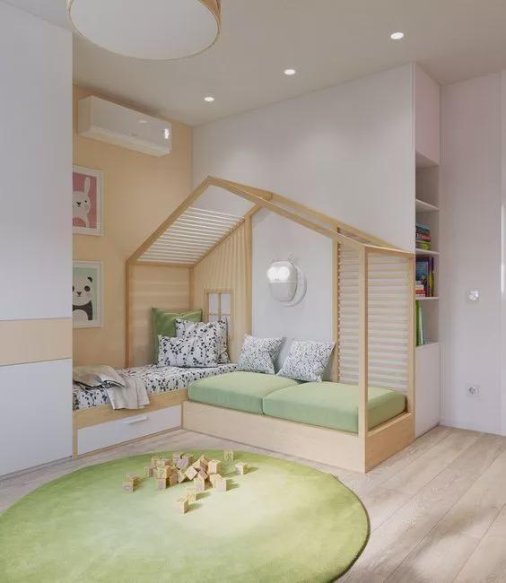 高度较低的榻榻米,保证了孩子们的安全,而铺满整个房间的榻榻米,拓宽了床的范围,让小孩子倍感自由自在。