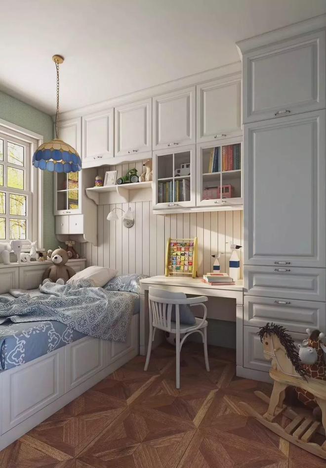 同时为了小孩子们的安全起见,所有的书桌柜子等有棱角的物体,都可以提前打磨做成圆角的设计。