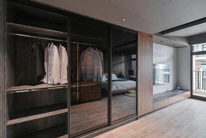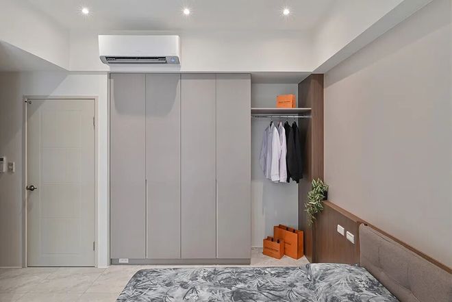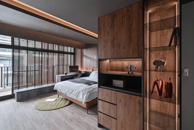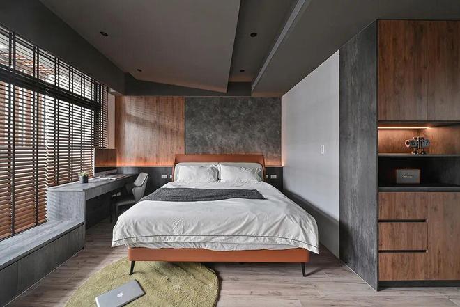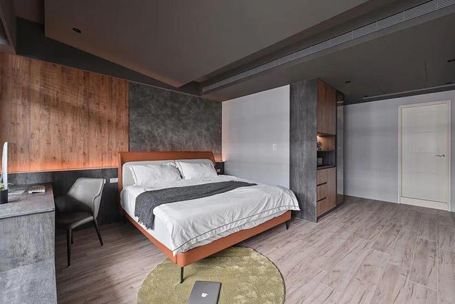 以暖系木质勾勒床背板,并形塑一座单侧衣柜