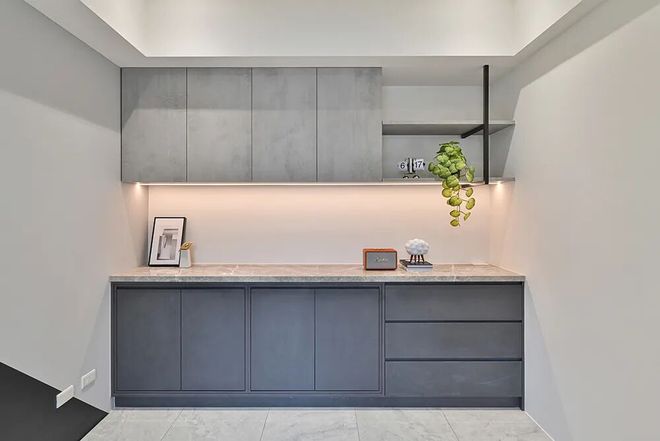 再往楼梯斜角漫入,即是家中财位,砌造柜面作为展列