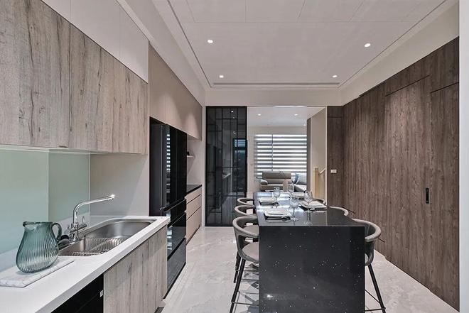 刻意援引风格强烈的深灰色、暖木调
