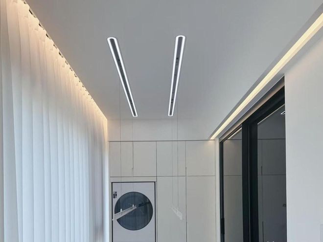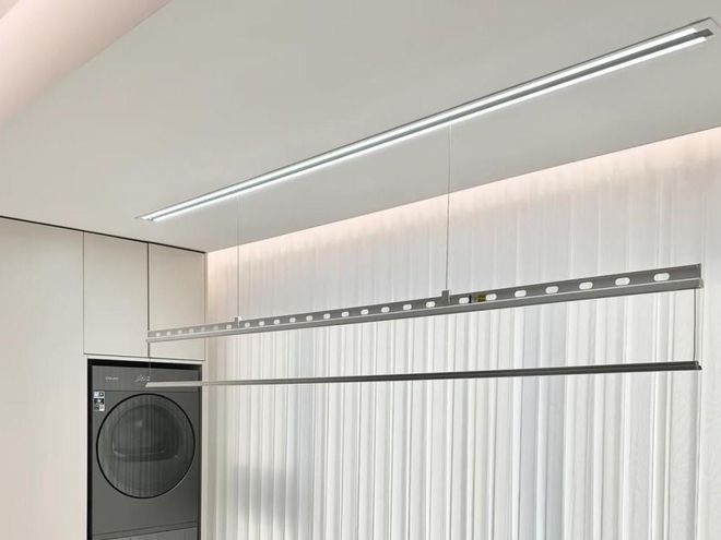 做法建议:隐形晾衣架在装修设计的时候要提前考虑好尺寸,做好隐形槽。安装时还要确保牢固,尽量做到与阳台顶板融为一体,效果更好。