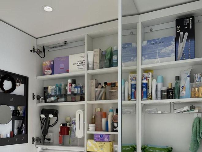 只要体验过就知道,有了浴室柜和镜柜,整个台面都干净了,洗漱用品清洁用品都能收进柜子,台面干爽又整洁。而且是挂墙悬空,没有卫生死角。镜柜既能储物又能延伸空间的视觉感。