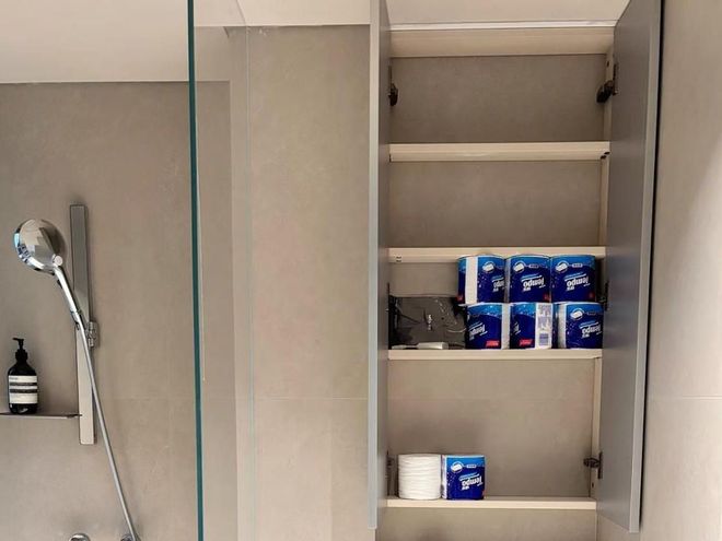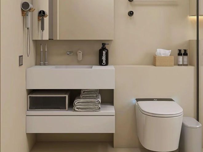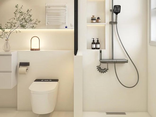 别小看这个台面,是入住后绝佳的收纳和展示区。用来放置香薰、绿植、毛巾、手机等。明显的提高小卫生间的储物,视觉上也更轻盈,有层次,避免压抑感。