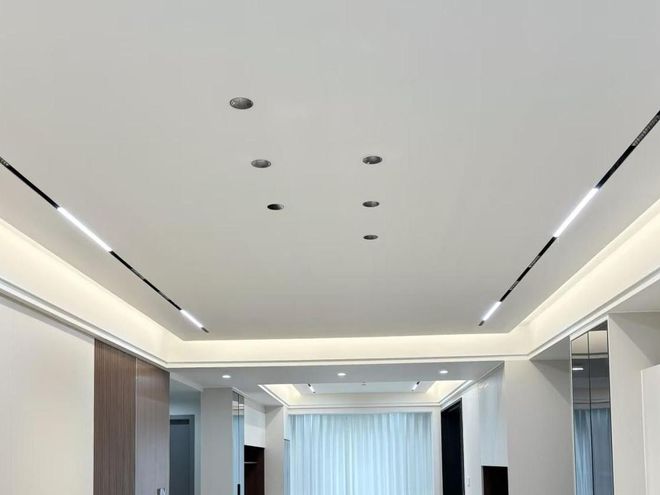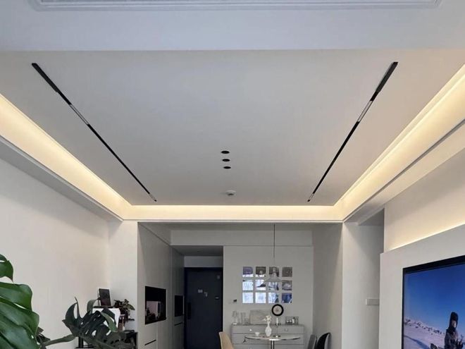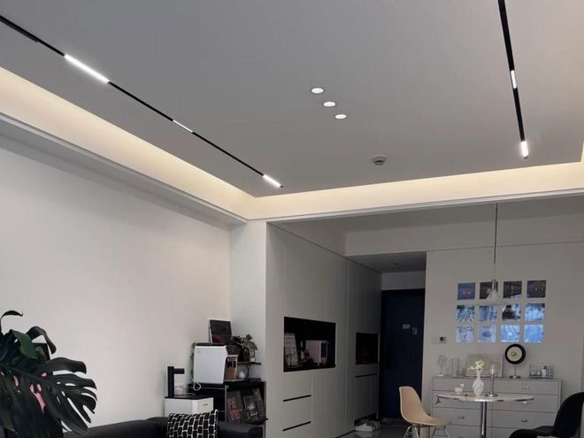 再看现在年轻人的做法,是采取的无主灯设计。主要是使用了筒灯,射灯,轨道灯,磁吸灯,并搭配有灯带,营造无主灯。