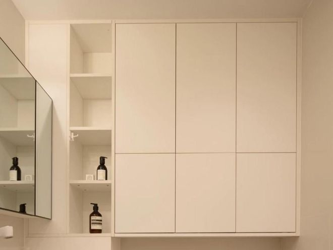 卫生间装修还得是看年轻人,他们采取的是壁挂式的浴室柜和镜柜的组合。将浴室柜悬挂,墙面镜柜延伸到,两个柜子几乎解决了卫生间所有物品的收纳。