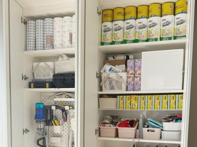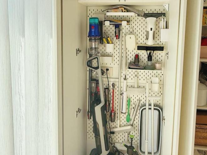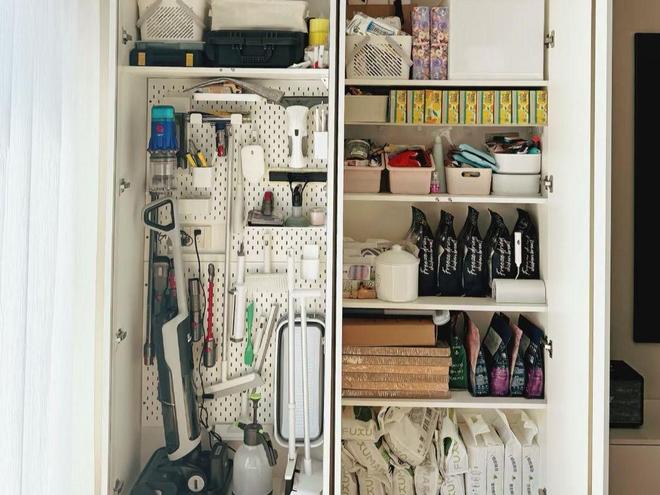 只需要在阳台的一面墙上,例如侧墙定制通顶家政柜。内部一般可以配置洞洞板,挂钩,部分层板。就是这一个小小的柜子,几乎可以将家里的清洁工具收纳殆尽。