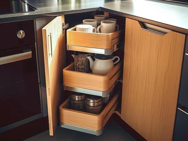 现在,有很多人的做法很明智,在厨房转角的位置安装了五角旋转拉篮。它是通过精密的轨道系统,实现轻轻一拉即可将转角伸出的物品送到前面来。