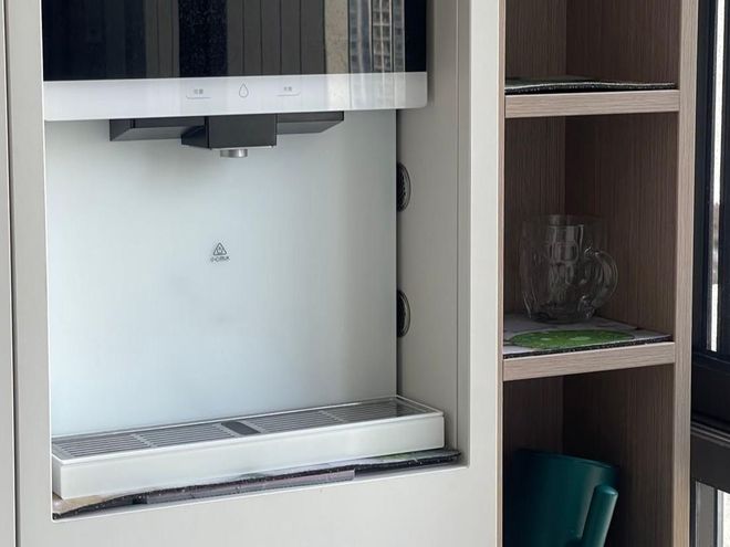 管线机的薄柜子,让视觉更整洁,所有的管线都暗藏,墙面也干净利落。关键的是可以增加收纳,收纳杯子,茶叶,纸巾等用品都可以。还能够防止孩子直接接触管线机,避免带来危险。