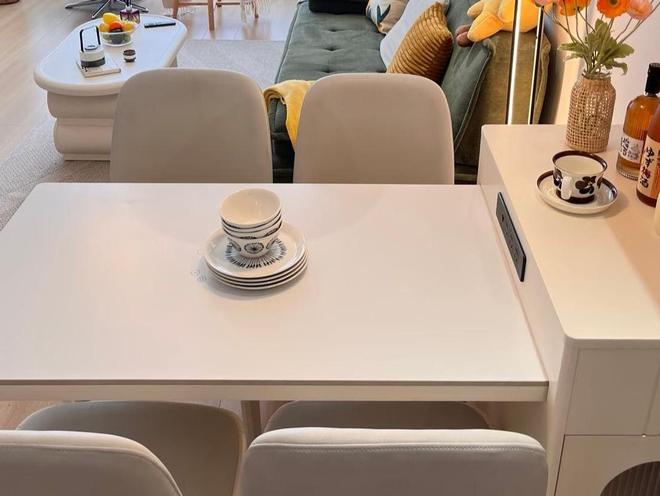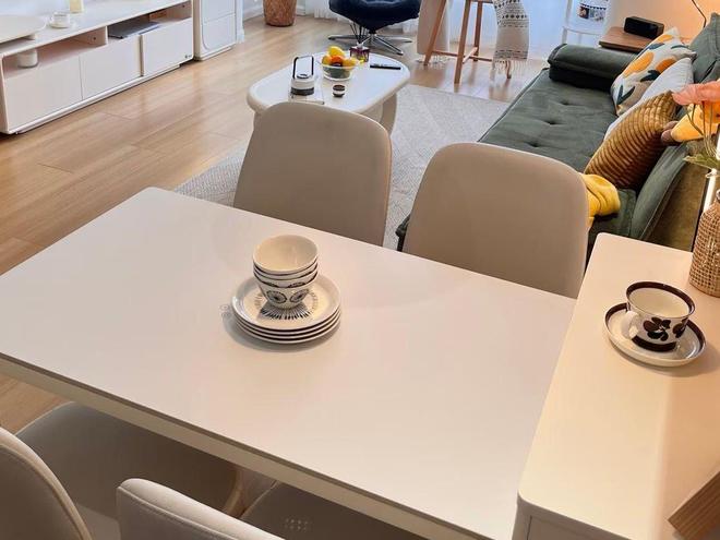 做法建议:伸缩式餐桌一定要选择高质量滑轨,确保长期使用不变形。展开以后,要看一下地面是否平整,避免桌子晃、卡顿等。