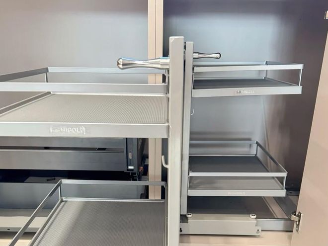 做法建议:转角拉篮的安装,需要精准测量好角度,所以建议找专业人员安装。另外要定期清洁轨道,防止油污积累影响轨道的顺滑。