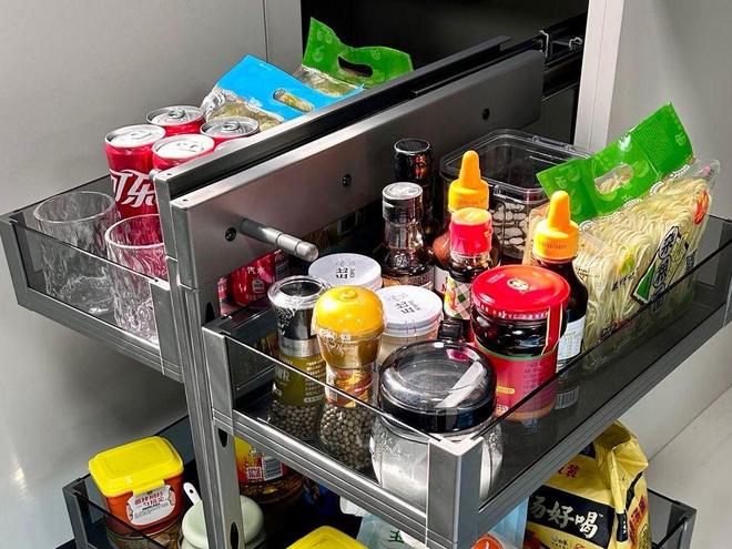 现在有越来越多人坚持做的一个收纳,就是厨房的转角拉篮。可以说,是完美化解墙角的尴尬。