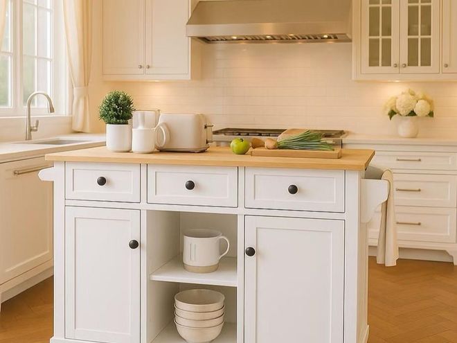 做法也非常简单,只需要定制一个带有万向轮的多层移动岛台。上层可以作为操作区、置物区,中层装上抽屉,下层可以作为开放式储物区。