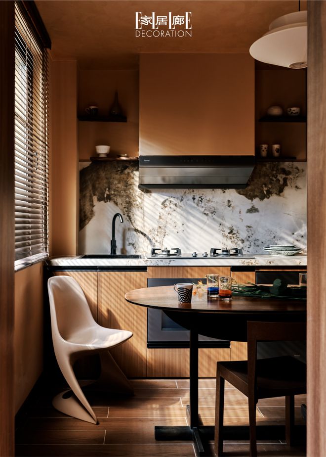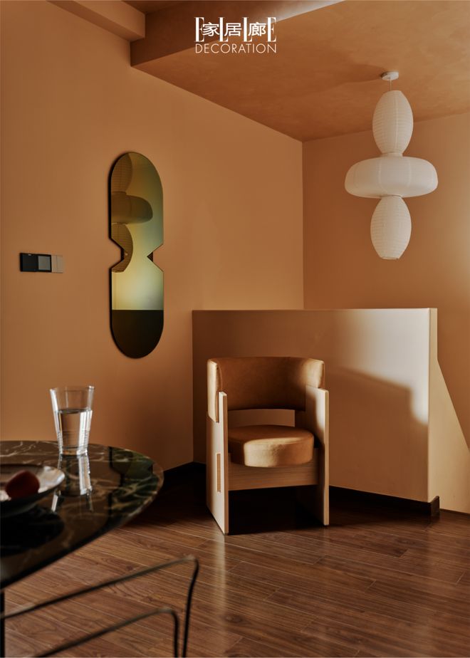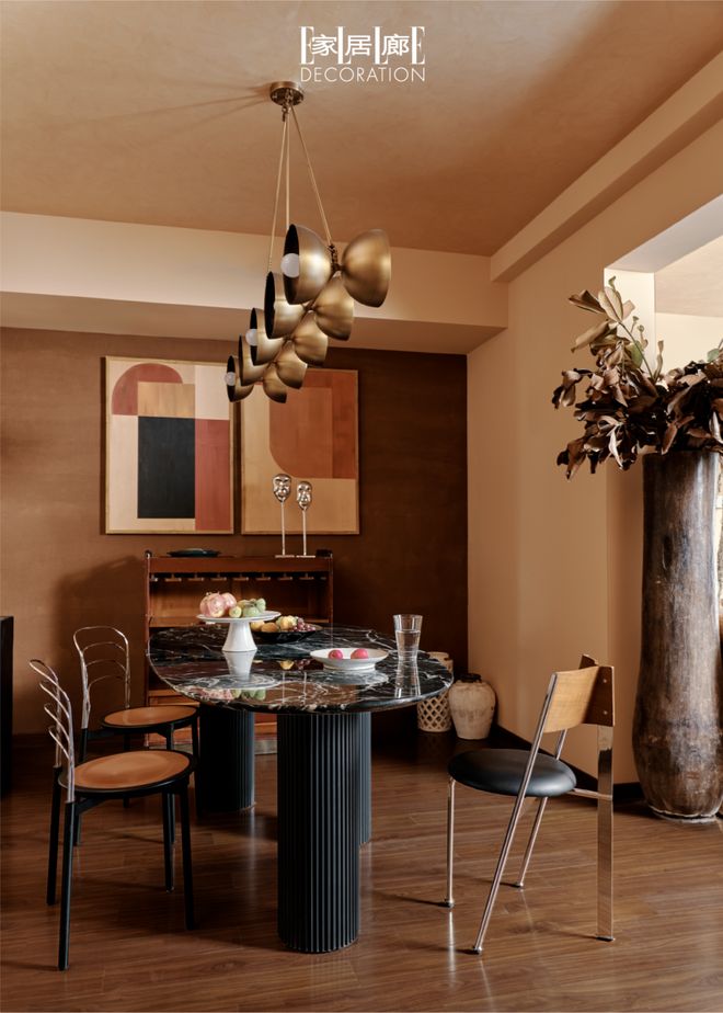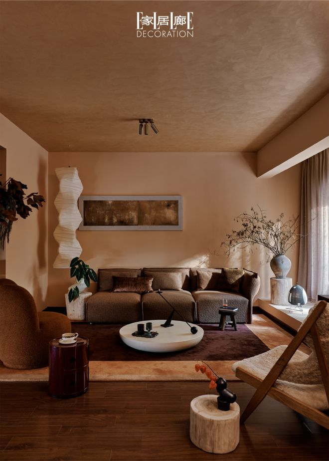 穿过树木林立的小径,走进Heddy家,“色彩、质感、碰撞”等等独特个人设计语言,以一种更为柔软与平和的方式呈现于眼前,天顶、墙面、家具、灯光.....各种媒介和细节,以温暖的古铜大地色系为主调,用不同的形式和质感自然融合,展现出其设计语言中所贯彻的生机勃勃,但又更为醇厚和温柔。舍弃了玄关的客厅,以两处不同形态的沙发自然围合,构筑起整体舒适自在的社交场域。