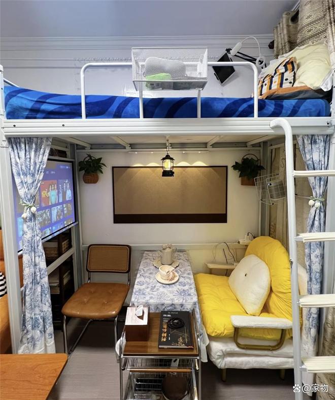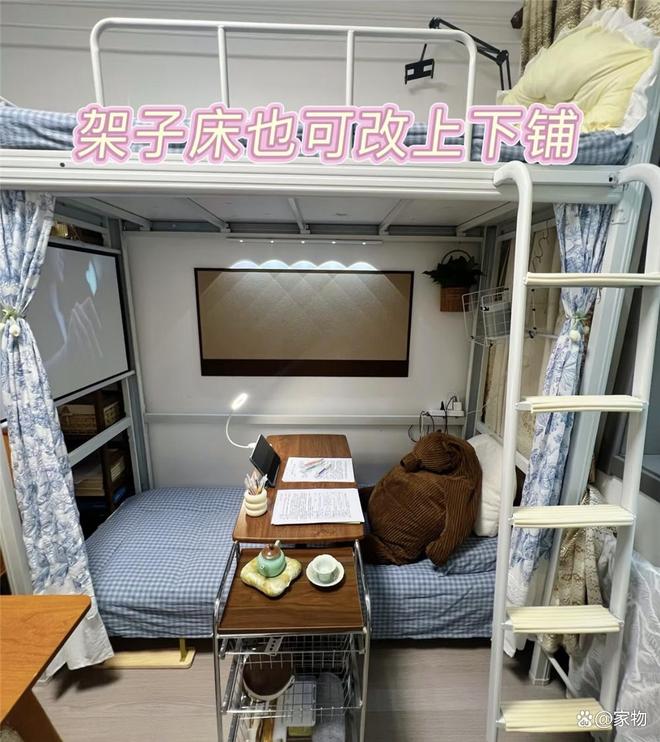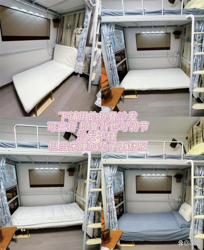 虽说是上下铺,但因为是定做的,且增加了宽度,睡起来其实还挺舒服的,起码要比很多学生宿舍舒服。
