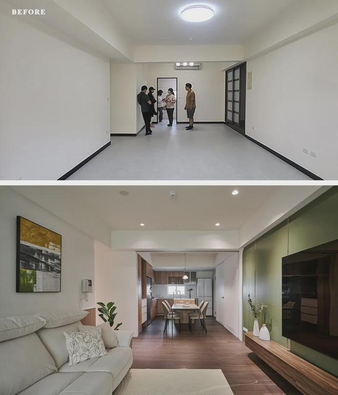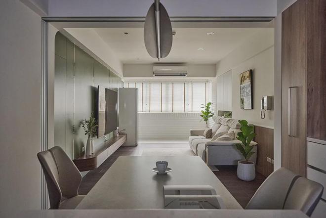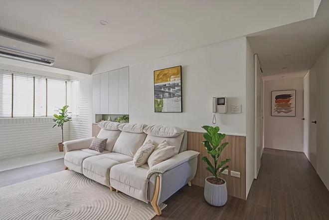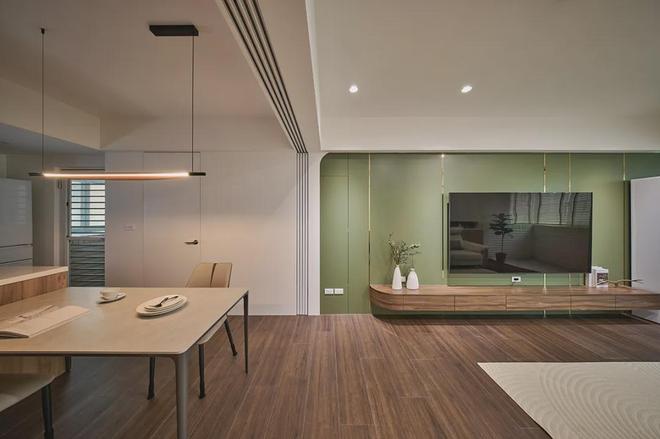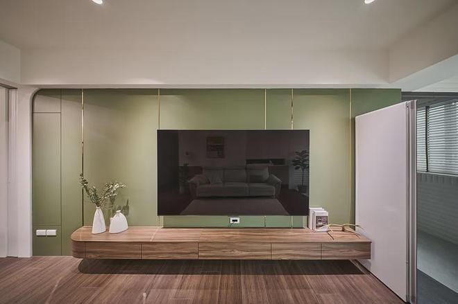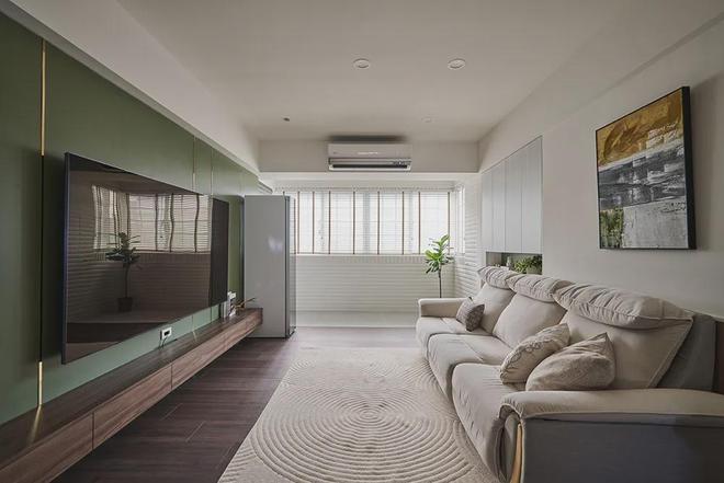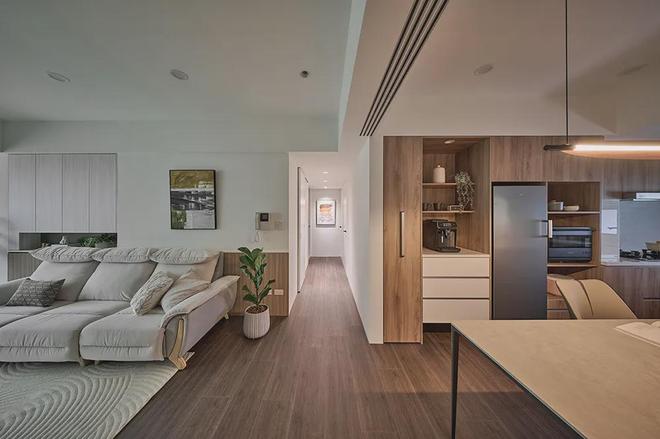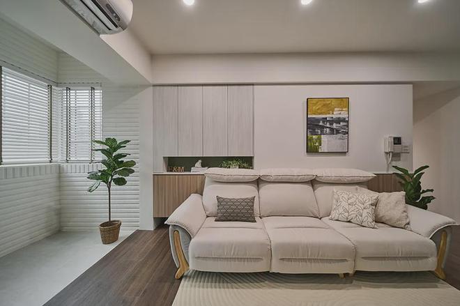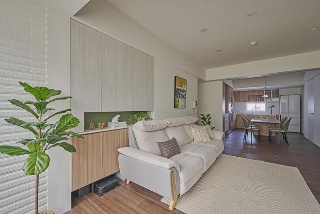 这道墙面在采取挪移之后,沙发柜正好隐入于墙