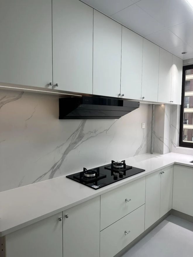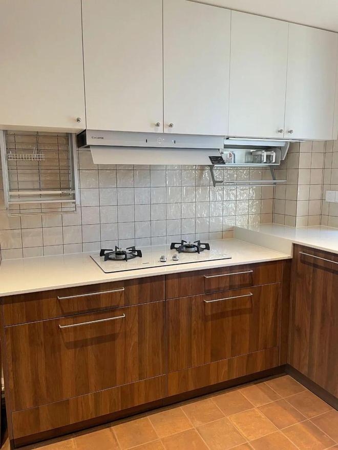 升级版做法:其它地方不说,灶台墙面一定贴大砖,或者买一块大规格岩板加工一下贴上去,真正无缝一体,美观又好打理。