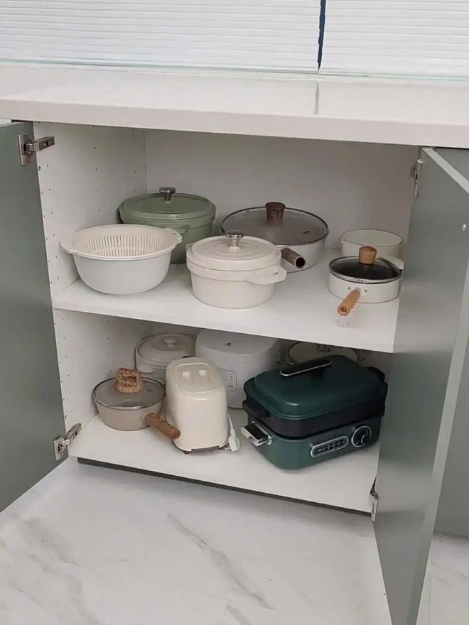 不过我们在设计时可以优化一下,比如给吊柜做双层设计。上面柜子用来囤物,下面柜子用来收纳高频物品。
