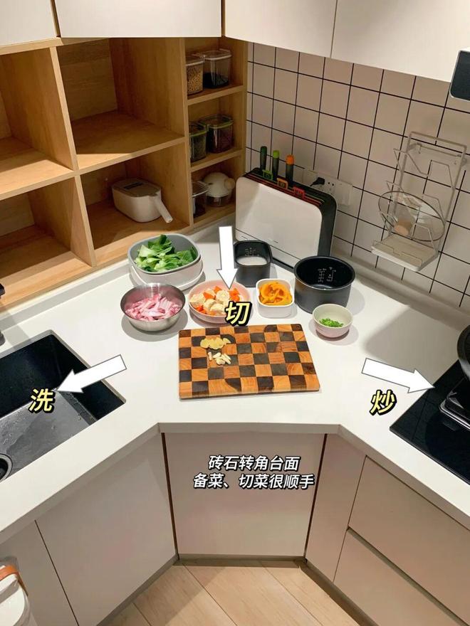 升级版做法:给橱柜做钻石转角,不仅柜体收纳好用,操作台空间也变大了,非常适合用来切菜、备菜,而且动线十分流畅。