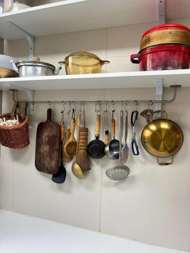 于是,一些“大聪明”就放弃吊柜,选择给墙面安装上隔板,想着这样拿取更方便,空间也更通透。