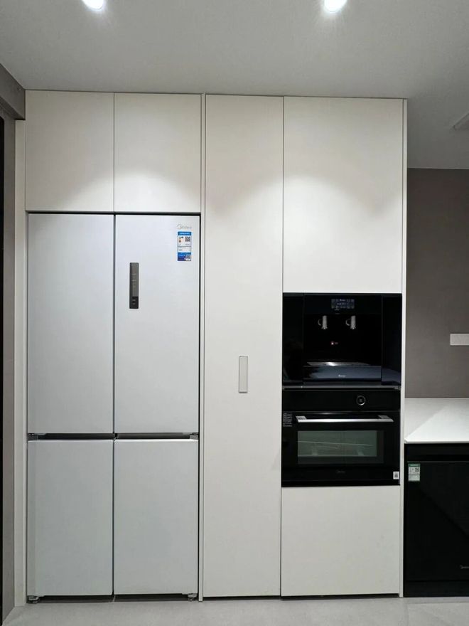 蒸烤箱可以选择一体机,减少空间占用;电器多做几层抽拉开放隔层,满足其它小家电收纳。
