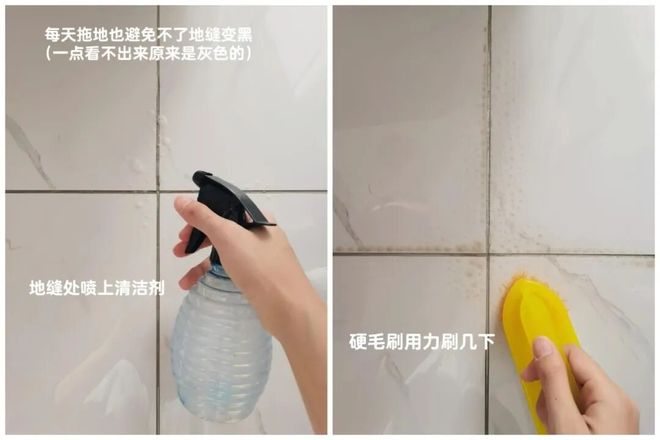 如果是顽固的污渍,可以用「2泵洗衣液+水」调个清洁剂,喷洒到缝隙处后再用硬毛刷用力刷几下,最后再一拖,同样很干净。