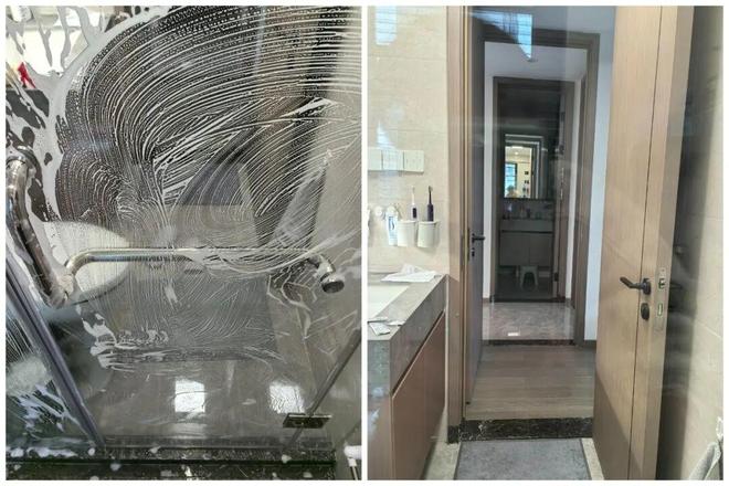玻璃门上的水垢,得先打出泡沫静置一会,然后再用塑料袋或者百洁布绿色那一面擦,最后用水一冲,干干净净。