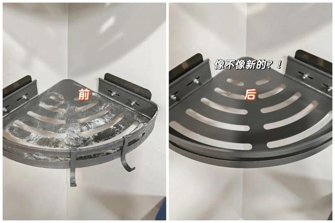 五金架架上的皂垢,同样可以用「白醋+洗洁精」处理,方法与清洁水垢一样。