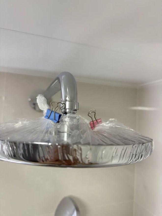 如果拆不下来,就用浴帽把柠檬酸水装起来,再用夹子固定到喷头上,同样可以起到清洁的作用。