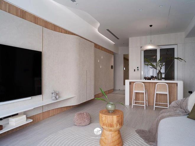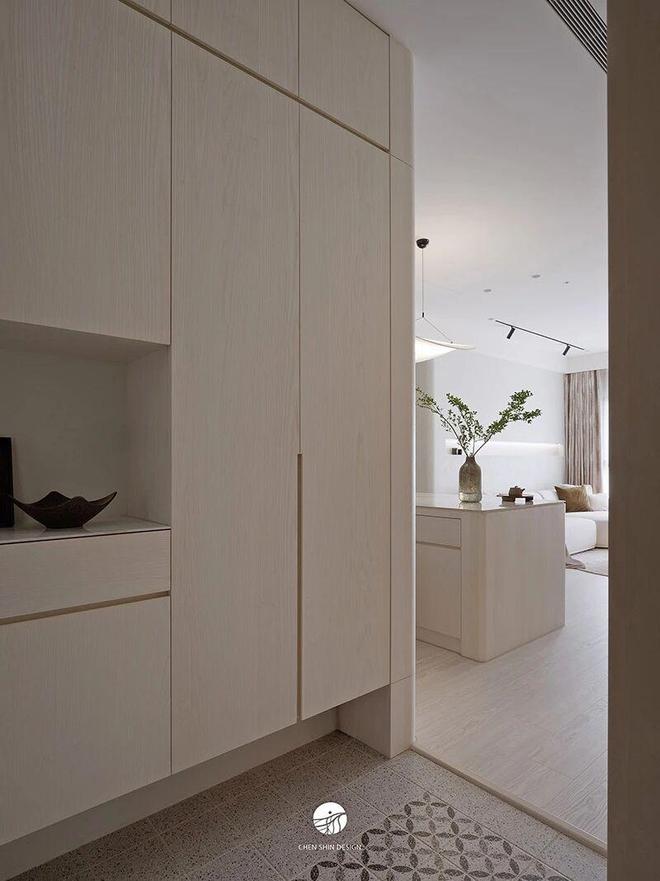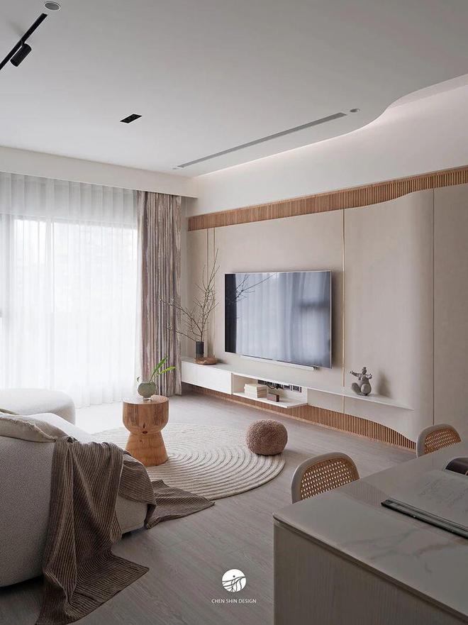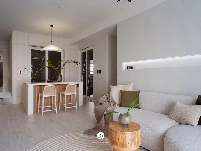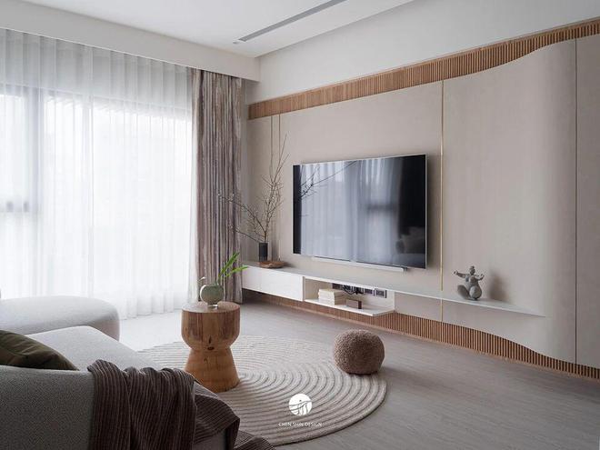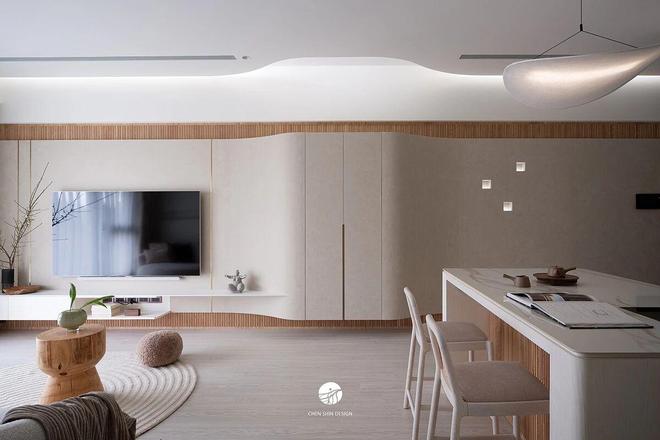 时深时浅的往客厅方向漫入,予以木质调的带状格栅饰面