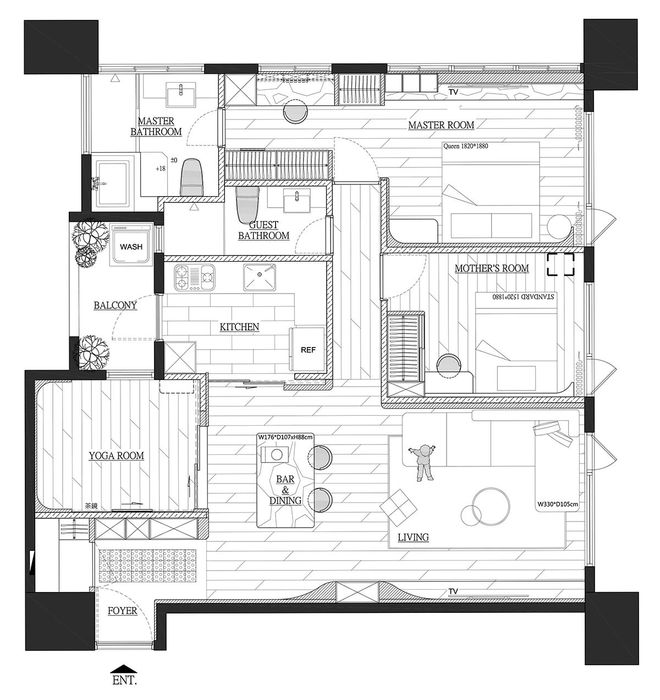 期盼带入日式温泉会馆的沉静感,以干湿分离规划两域。