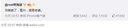 黄海波微博传喜讯:当爸爸了高兴!感恩老婆